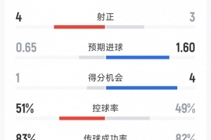 尤文1-0博洛尼亞全場(chǎng)數(shù)據(jù):射門(mén)13-12,射正3-4,得分機(jī)會(huì)4-1