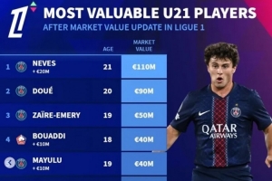 體育資訊12月15日訊 德轉(zhuǎn)更新了法甲球員身價(jià)情況,并列出了U21最貴身價(jià)榜,內(nèi)維斯壓杜埃居首。