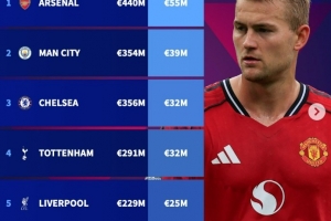 體育資訊12月16日訊 德轉(zhuǎn)盤點了英超Big6球隊防線平均身價榜(不包括門將),其中阿森納高居榜首,具體如下(防線總身價+平均身價):