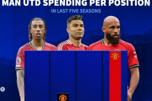 體育資訊12月16日訊 德轉盤點了近5個賽季曼聯(lián)在各個位置引援花費情況,其中鋒線引援花費明顯最多,具體如下: