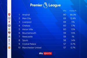 根據(jù)Opta目前的最新預(yù)測,如果阿森納及其爭冠對(duì)手繼續(xù)這樣踢下去,那么槍手只需70分即可奪冠。