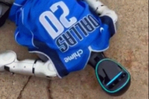 視頻中一個穿著獨行俠球衣的機(jī)器人正在施展回旋踢等招數(shù),歐文溜過來使勁推了一把,機(jī)器人應(yīng)聲倒地沒了動靜。