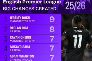 本賽季英超創(chuàng)造重大機會榜: