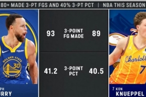黃蜂主場迎戰(zhàn)老鷹,轉(zhuǎn)播方曬出新秀克尼佩爾的數(shù)據(jù),本賽季僅有兩位球員在命中率40%以上的情況下命中了80記三分球,分別是: