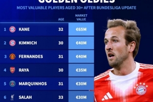 1.哈里·凱恩(拜仁),32歲,6500萬(wàn)