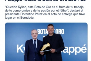 在這里,你正穿著你如此渴望的白色球衣,書寫著你自己的歷史。我們的球迷崇拜你,并將在每一次挑戰(zhàn)中陪伴你。親愛的姆巴佩,這座金靴獎(jiǎng)對(duì)你來(lái)說是繼續(xù)贏下去、繼續(xù)為皇家馬德里的偉大歷史做出貢獻(xiàn)的又一動(dòng)力。