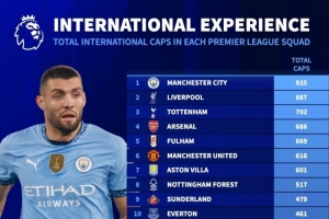 體育資訊11月1日訊 德國轉(zhuǎn)會市場統(tǒng)計(jì)了英超各隊(duì)球員為國家隊(duì)出戰(zhàn)的場次,并列出榜單,曼城925場居首,利物浦887場次席。