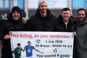 拉德林格提到了2018年哈蘭德身披莫爾德球衣對陣布蘭時(shí),對他上演大四喜的往事。牌子上寫道:“嗨,埃爾林,你記得嗎?2018年7月1日,莫爾德4-0布蘭,你對我打進(jìn)了4球!能請你把你的球衣送給我嗎?”