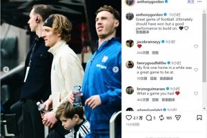 戈登賽后更新社媒動態(tài),曬出多張此役的照片,配文:“精彩的足球比賽,雖然最終本應(yīng)取勝,但這場的出色表現(xiàn)可以成為繼續(xù)進步的基石?!?/p>