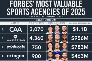 體育資訊12月21日訊 美媒Boardroom報道,根據福布斯的數據,體育經紀公司CAA仍然穩(wěn)居行業(yè)領先地位,他們管理著超過200億美元的合同。它在福布斯2025年榜單上以11億美元的傭金位列榜首,自2022年以來增長了18%,管理著超過3000名體育及代言客戶。