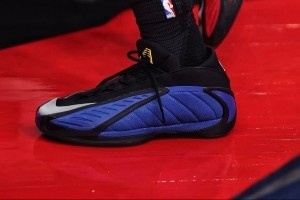 這雙球鞋采用外側(cè)藍色、內(nèi)側(cè)紅色的陰陽配色,鞋后跟處則有堪薩斯大學(xué)的吉祥物。