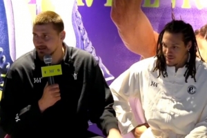 體育資訊12月22日訊 當(dāng)?shù)貢r(shí)間今天下午,掘金球星約基奇和戈登在球隊(duì)主場(chǎng)舉辦他們?nèi)潞灻娜虬l(fā)布活動(dòng)。
