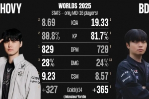 體育資訊11月1日訊 外媒統(tǒng)計Chovy與Bdd數(shù)據(jù)對比(S15全球總決賽),具體如下: