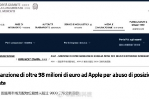 體育資訊12月22日訊 意大利競(jìng)爭(zhēng)與市場(chǎng)管理局(AGCM)今日宣布,對(duì)蘋果公司、Apple Distribution International 和蘋果意大利公司處以 9863.5 萬歐元(現(xiàn)匯率約合 8.14 億元人民幣)罰款,原因是濫用市場(chǎng)支配地位。