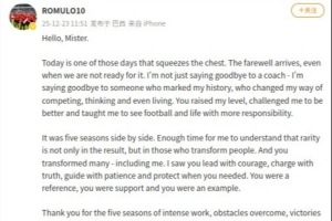 今天真的是讓我感到難過,離別總是來得那么突然,讓人措手不及。我不僅僅是在向一位主教練告別,更是在向一位給我留下深刻印記的人告別,他改變了我的比賽方式、思維模式乃至日常生活。您提升了我的競(jìng)技水平,激勵(lì)我變得更好,并教會(huì)我?guī)е嘭?zé)任感看待足球和生活。