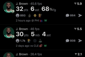過去四場比賽,杰倫-布朗砍三場30+,其中一場40+,場均能夠轟下29.5分。