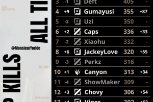 體育資訊11月1日訊 外媒統(tǒng)計(jì)全球總決賽總擊殺數(shù)榜單,具體如下: