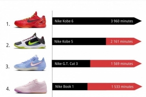 體育資訊11月3日訊 球鞋媒體Kixstats發(fā)布了NBA新賽季十月份的球鞋上腳時間排行。前十之中有三雙科比的球鞋,分別排在第一、第二和第五。