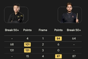 本場(chǎng)比賽,周躍龍轟出兩桿破百和兩桿50+,??反虺鑫鍡U50+。雙方前八局比賽打成4-4平,最后??愤B勝兩局拿下比賽勝利。