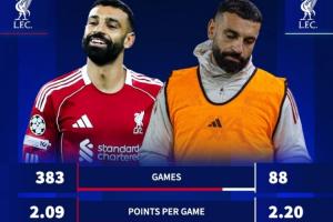 德轉(zhuǎn)統(tǒng)計:薩拉赫出戰(zhàn)時利物浦場均2.09分,缺席88場場均2.2分