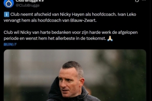 距離在歐冠對陣阿森納僅剩2天!布魯日官宣主教練尼基·海恩下課