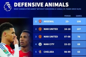 阿森納連續(xù)108場比賽失球少于3粒,創(chuàng)造英超球隊紀(jì)錄