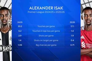 得不到支持?伊薩克利物浦時(shí)期對(duì)比紐卡,觸球、射門等數(shù)據(jù)均下降