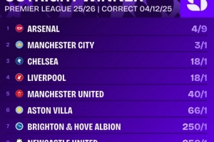 英超最新奪冠賠率:阿森納居首,曼城、切爾西、利物浦前四